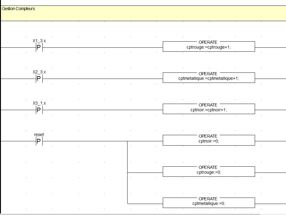 Avec un libre cours à nos idées, on a décidé de rajouter un compteur de pièces selon leur type, affiché dans une IHM. Si un dépôt n’avait plus la place d’accueillir une pièce supplémentaire, alors on envoyait à la station précédente la consigne de ne plus envoyer de pièces et de les passer à la station 5 le temps que les dépôts soient vidés. Cette amélioration majeure de la consigne de base a permis de tester plusieurs méthodes de comptage sur le logiciel.