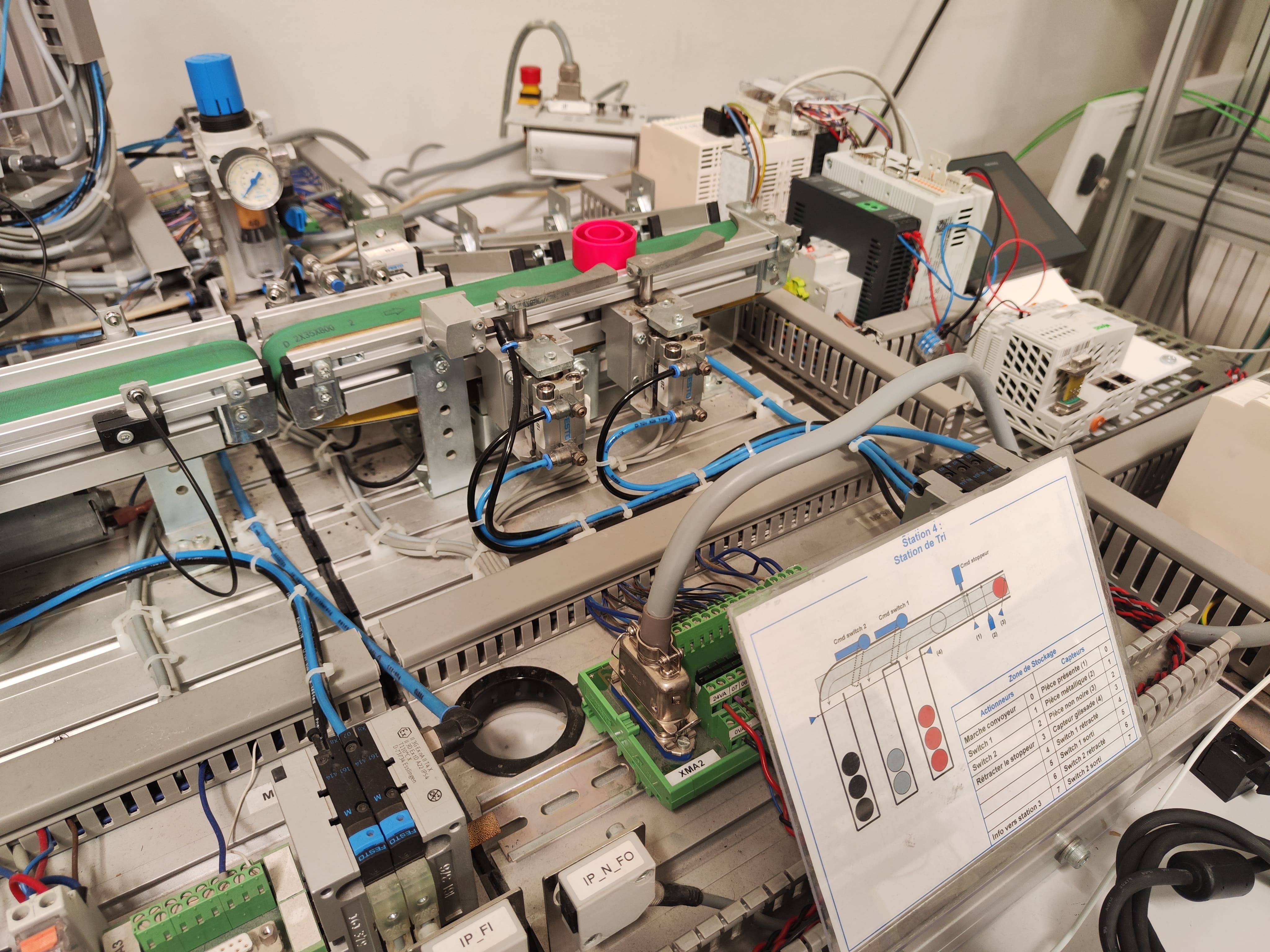 Pour ma part, j’ai travaillé sur la station 4, qui était une station de tri. Celle-ci acheminait les pièces à l’aide d’une courroie vers trois zones de dépôt distinctes, en fonction du type détecté : pièces rouges, noires ou métalliques.