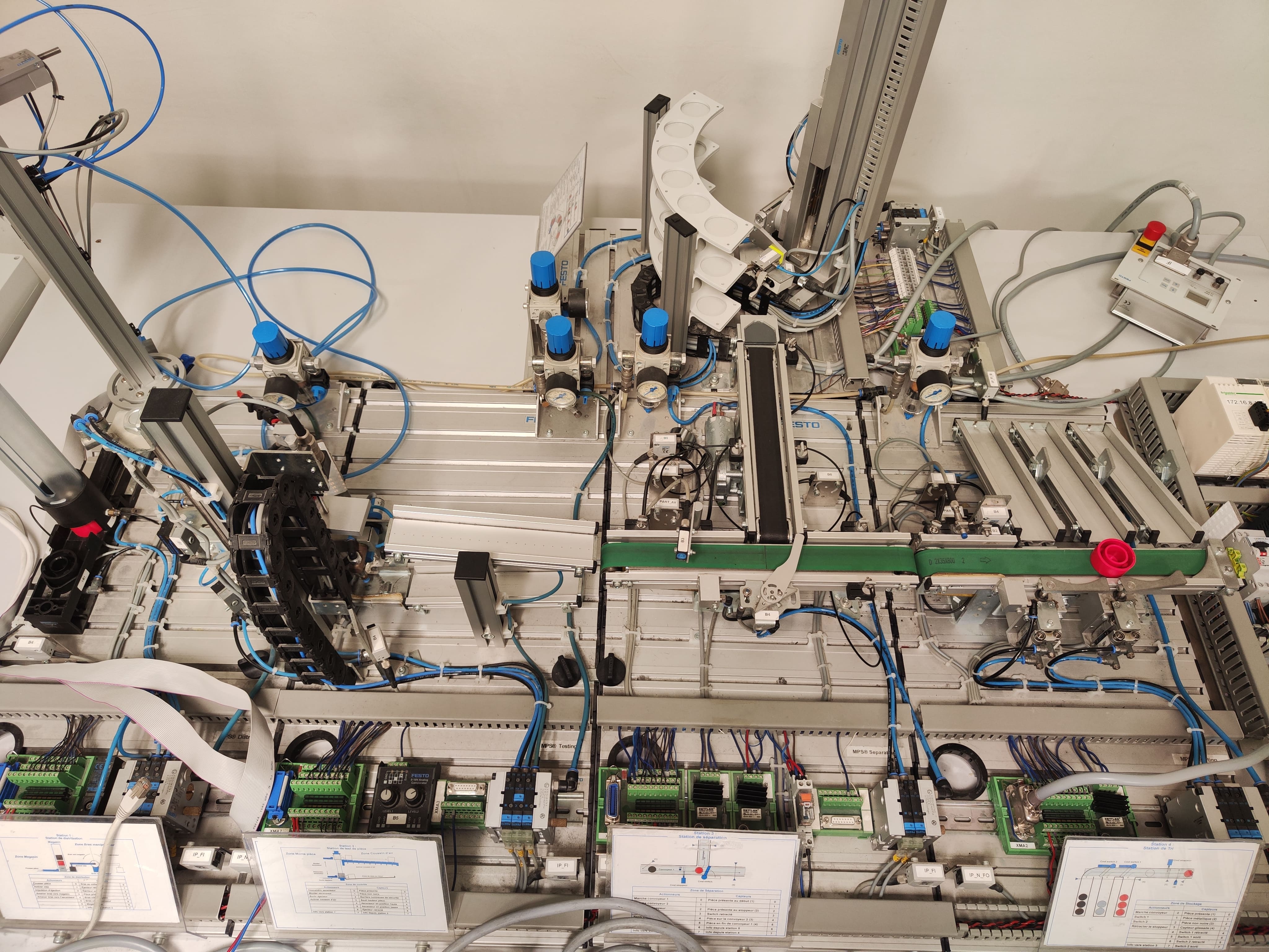 La station 1 servait de station de distribution. Elle récupérait les pièces, rangées en colonne, à l’aide d’un bras manipulateur afin de les transférer vers la suite de la chaîne. La station 2 jouait le rôle d’un ascenseur, permettant d’acheminer les pièces vers la station 4 ou la station 5, via le tapis roulant constituant la station 3. La station 5 correspondait à une zone de stockage, utilisant un translateur pour assurer le rangement des pièces.