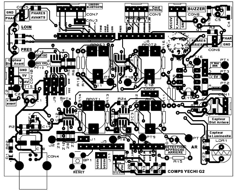 Pour commencer, nous sommes partis de la modélisation de la carte analogique sur le logiciel Protheus, en utilisant les règles de routage des liens entre les composants et en respectant les contraintes qu’elles imposent. Le mappage était dicté par l’organisation des différentes fonctions de la Smart Car (fonctionnement moteur, buzzer, filtre passe-bas, etc.) du schéma électrique fourni.