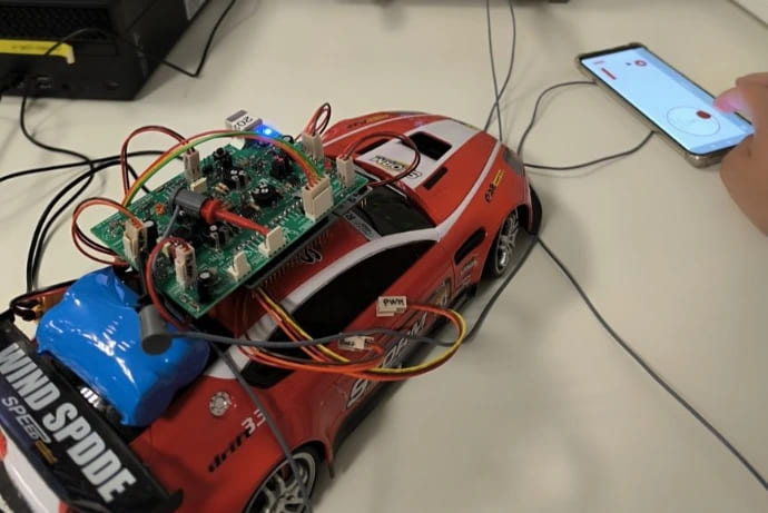Ensuite, nous sommes passés à la partie numérique, avec le codage des fonctions en C++ sur Visual Studio. Chaque fonction de la voiture télécommandée nécessitait une étude et une analyse fonctionnelle. Par exemple, pour la connexion Bluetooth, il fallait étudier l’application mobile utilisée et la connectivité avec le périphérique attaché à la carte Arduino. Il a également été nécessaire de rechercher les valeurs numériques à convertir par rapport aux valeurs analogiques des capteurs de distance situés à l’avant et à l’arrière de la maquette.